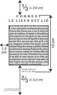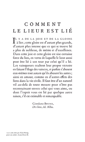 de Giordano Bruno. Composition en Poliphilus-MT, corps 24, 11,8 et 10, et en Blado corps 10. Format 10 × 16,6 cm. Août 2008. |