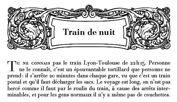 Composition en Bauer Bodoni corps 10,3, Titre en Bauer Bodoni corps 16 et Goudy Ornaments corps 66,94. Format : 14,85 cm × 21 cm. Mars 2008. Téléchargement du PDF. |